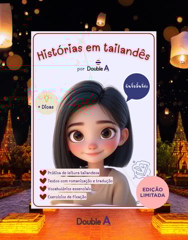 Chegou o nosso primeiro livro autoral com 20 histórias em tailandês + romanização e tradução para você treinar a sua leitura e entendimento.