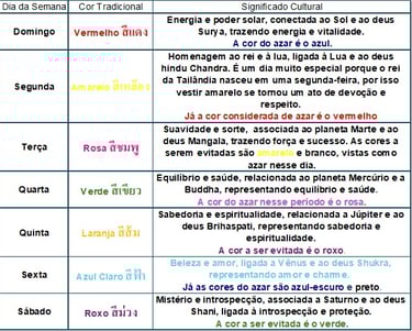 Na Tailândia, cada dia da semana tem sua própria cor, sorte e até azar. Para os tailandeses, seguir essa prática é uma forma de manter equilíbrio e proteção. Para os visitantes, é uma oportunidade única de mergulhar em um aspecto encantador da cultura local.