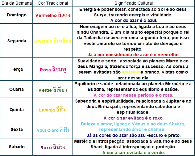 Essa tradição tem raízes na astrologia hindu, incorporada ao budismo tailandês. Cada dia da semana é regido por um deus, associado a um corpo celeste e a uma cor específica. Usar a cor correspondente ao dia é visto como uma forma de atrair sorte, proteção e harmonia, enquanto evitar as cores consideradas “do azar” ajuda a afastar energias negativas.