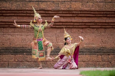 Lakhon: É uma dança mais suave e expressiva, geralmente interpretada por mulheres, que enfatiza gestos delicados, graciosidade e narrativa dramática. Diferente do Khon, o Lakhon não exige máscaras, permitindo que as expressões faciais complementem a história.